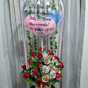 Arreglo, con rosas, girasoles, camcion de la india, monte casino, sobre una base cuadrada de madera